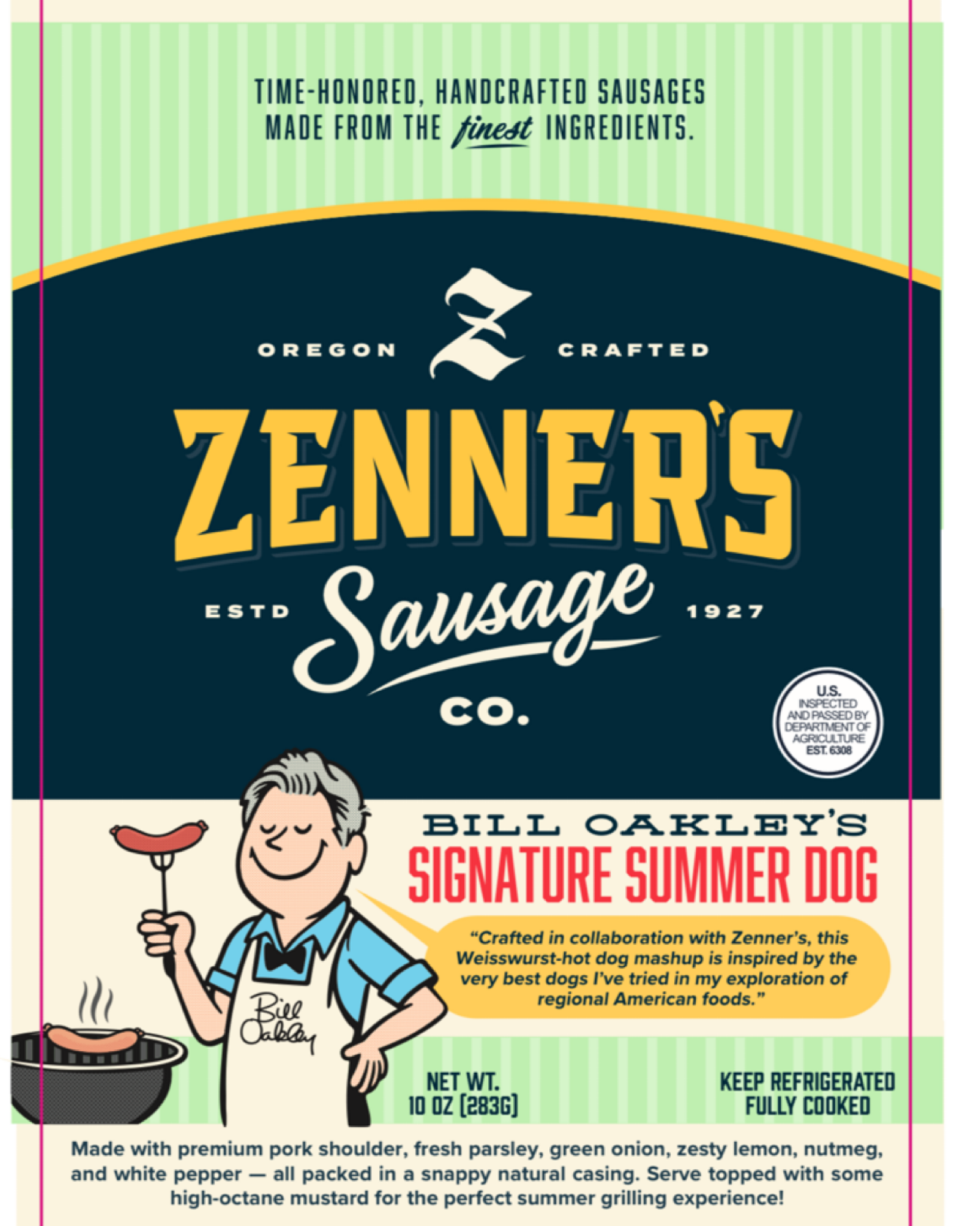 This snappy Weisswurst–hot dog mash-up was crafted in collaboration with the artisan butchers at @zennerspdx. After extensive tasting of the test batch, Bill Oakley confirms its delicious flavor and perfect snap. Although any topping works, a bold, high-octane mustard truly brings out the best in every bite.